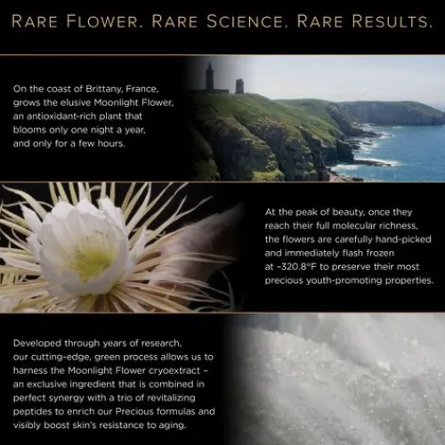 A New Vision Of Luxury, Rare, Powerful, Committed To Responsible Beauty. Inspired By Plants And Driven By Science, This Crystal Clear Treatment Essence—Infused With Precious Moonlight Flower Cryoextract And A Trio Of Revitalizing And Replenishing Anti-Aging Peptides— Deeply Hydrates, Softens And Refreshes, Providing An Immediate Smoothing And Plumping Effect While Preparing Skin For Treatments To Follow. The Essential Prelude To The Clarins Precious Skincare Ritual. Rare Flower On The Coast Of Brittany, France, Grows The Elusive Moonlight Flower—The Beating Heart Of Our New Precious Skincare Collection. This Plant Blooms One Night A Year, And Only For A Few Hours, Bearing Flowers So Exceptionally Rare, They Are Harvested By Hand When They Reach Their Full Molecular Richness. Picked At The Peak Of Their Beauty And Potency, The Flowers Are Immediately Frozen At -196°C (-320.8°F) To Harness An Anti-Aging Cryoextract — A Precious Ingredient That Is Exclusive To Clarins. With Years Of Research, And Only One Night To Capture Its Power, This Cutting-Edge, Green, Natural Cryoextraction Process Preserves The Flower’S Most Fragile, Youth-Promoting Active Ingredients, To Visibly Boost The Skin’S Resistance To Aging.Rare Science La Lotion Is Powered With Clarins’ New Precious Skin Age-Delaying Technology—Our Most Advanced Innovation To Visibly Boost Skin’s Resistance To Aging While Replenishing And Revitalizing Skin. This Blend Of Moonlight Flower Cryoextract, Rich In Gallic Acid—A Powerful Antioxidant And Soothing Molecule—And 3 Biomimetic Anti-Aging Peptides, Visibly Smoothes And Refines Skin To Restore The Plump, “Bouncy,” Look Of Youth. The Exceptionally Fine, Refreshing Watery Texture Is Infused With Pure Plant Extracts To Address Premature Signs Of Skin Aging. Organic Leaf Of Life Extract Powers The Skin’S Natural Hydration. Organic Acerola Extract Boosts Skin’S Radiance.A Master Perfumer, Dorothée Piot, From One Of The Most Esteemed Fragrance Houses In Grasse, France, Was Commissioned To Craft A Signature Floral Scent To Capture The Essence Of Precious— Which Beautifully Combines A Delicate Caress Of Vanilla And Peony, With Hints Of Peach, Cedar Wood And Musk. The Unique, Fully Recyclable Glass Bottle Was Inspired By Nature And Designed In Paris. Responsible Luxury For Your Skin And Senses.