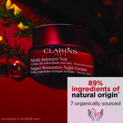 A Deeply Replenishing, Anti-Aging Night Moisturizer For Dry Skin That Minimizes The Appearance Of Lines, Wrinkles, Dullness, And Slackening Caused By Age-Related Hormonal Changes, While Evening Skin Tone—For A Visibly Smoother, Firmer, Radiant And More Youthful-Looking Complexion.This Next Generation Green Beauty Innovation Is Powered By 89% Ingredients Of Natural Origin. Clarins’ Proprietary New Lift-Replenish Duo Features Wrinkle-Fighting Organic Harungana Extract—As Effective As Retinol* And Gentle On The Skin—To Replenish And Visibly Minimize Loss Of Density And New Organic Gorse Extract, To Visibly Tighten And Improve Slackening Caused By Hormonal Deficiencies Linked To Menopause. Organic Shea Butter Deeply Nourishes And Soothes Even The Driest Skin. Organic Desert Date Extract And A Vitamin C Derivative Promote A More Even Skin Tone. Organic Sea Lily Extract Intensely Hydrates To Leave Skin Feeling Soft And Comfortable. Organic Service Tree Bud Extract Boosts Microcirculation While You Sleep For A Radiant Glow By Morning. Clarins’ Plant-Based Anti-Pollution Complex Features Nipplewort, Furcellaria &Amp; Organic White Horehound To Protect From Indoor And Outdoor Environmental Pollution, Including Skin-Aging Blue Light From Electronics. Skin Appears More Even, “Lifted” And Revitalized; Lines And Wrinkles Are Visibly Reduced.The Rich, Sensorial, Pale Pink Cream Melts Into The Skin Providing An Immediate Feeling Of Comfort And Well-Being To Very Dry Skin.*In Vitro Test On Collagen Synthesis